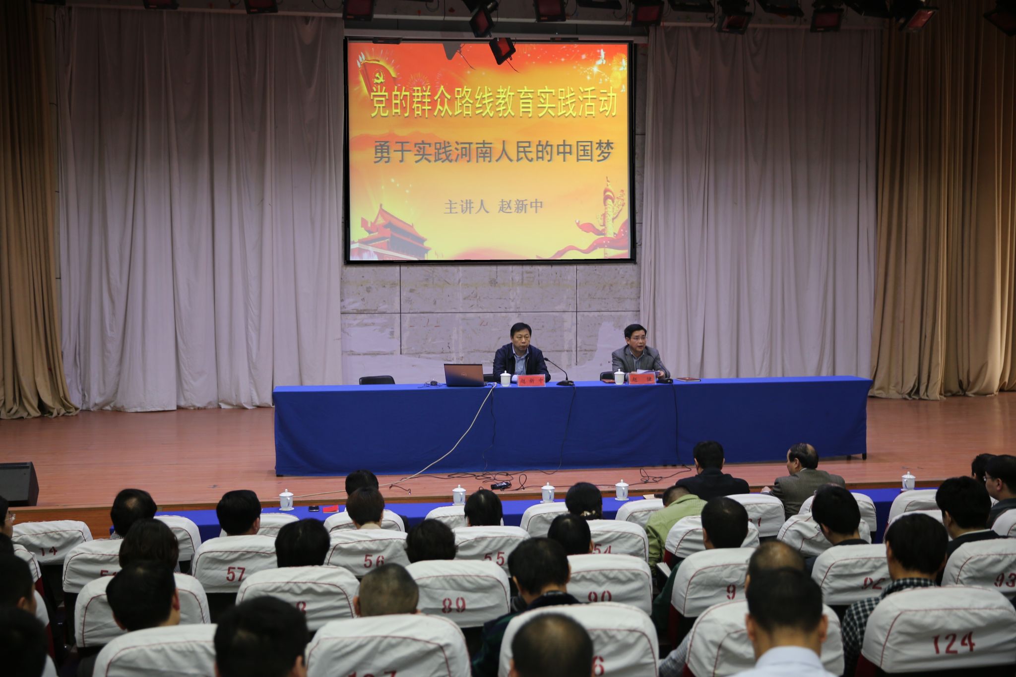 为深入开展群众路线教育实践活动,4月1日下午,我院在七号楼举行群众路线活动报告会,邀请郑州航空港区管委会党委书记、郑州新郑综合保税区管委会副主任赵新中做《勇于实践河南人民的中国梦——建设中的郑州航空港经济综合实验区》做辅导报告。领导班子全体成员、副处级以上干部和党员代表参加报告会,报告会由院长赵健主持。