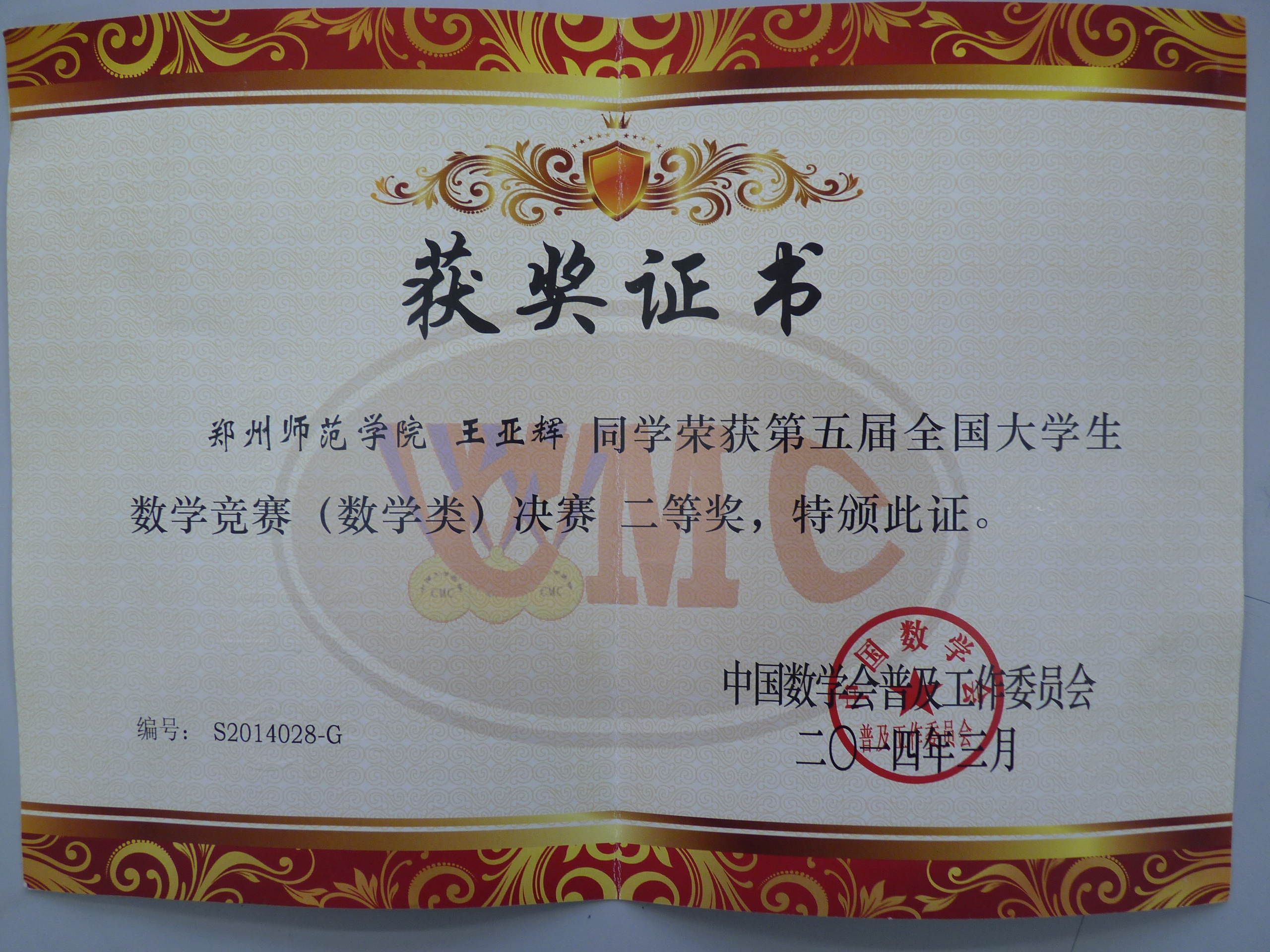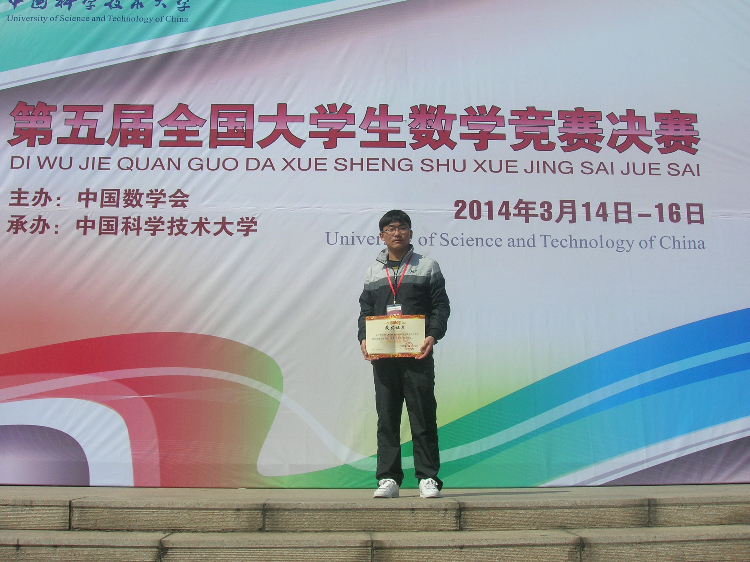 3月16日,第五届全国大学生数学竞赛决赛颁奖典礼在中国科学技术大学举行。我校数学与统计学院王亚辉同学通过河南赛区选拔赛,成功入围全国决赛,获得数学专业类二等奖,同时,我校也是本次比赛河南赛区唯一获得全国二等奖的高校。