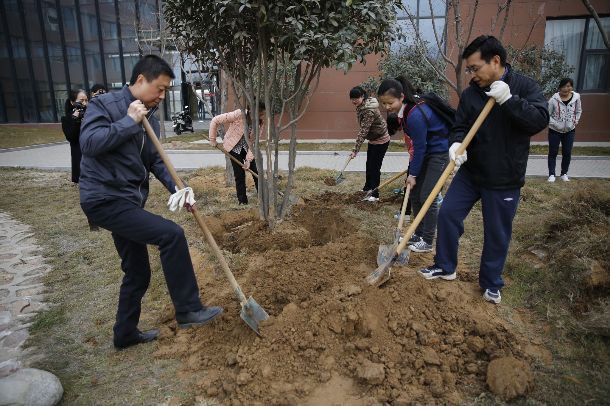 3月11日上午,校领导于向英、赵健、张建航、孔青在校党政办、基建处工作人员的陪同下来到东校区经管楼、坤山、学生宿舍,与在校师生共同培土植树,播撒新绿,靓化校园。