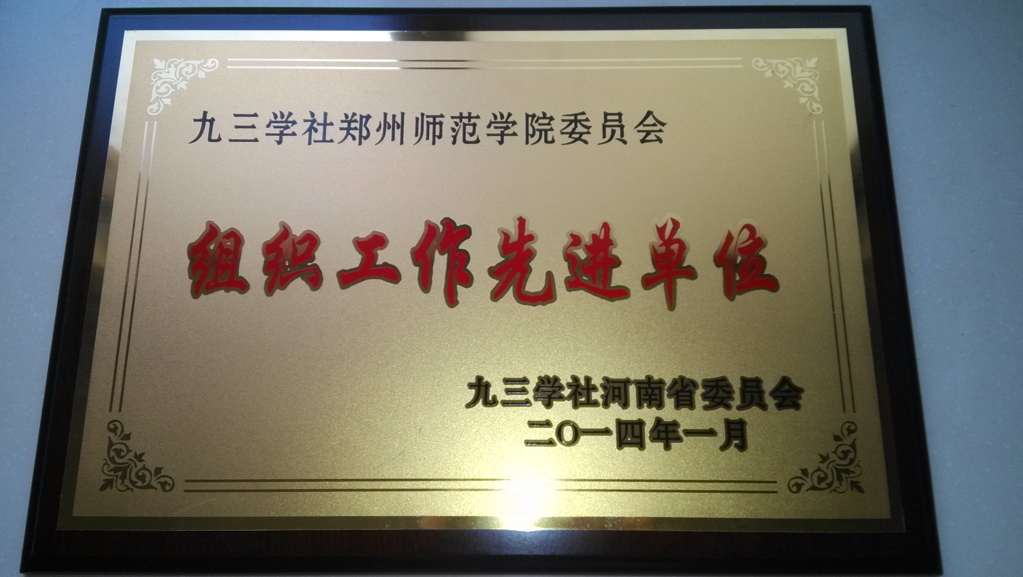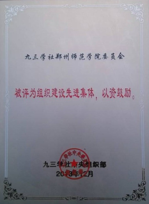 在九三学社河南省委和学校党委暨统战部的领导下,九三学社郑州师范学院委员会加强基层组织建设,积极履行参政议政、民主监督等职能,社会工作卓有成效,受到了九三学社中央和九三学社省委的高度肯定。近日,九三学社中央委员会授予九三学社郑州师范学院委员会“组织建设先进集体”荣誉称号。我校是十五个九三学社省直委员会中唯一一个获此殊荣的委员会。