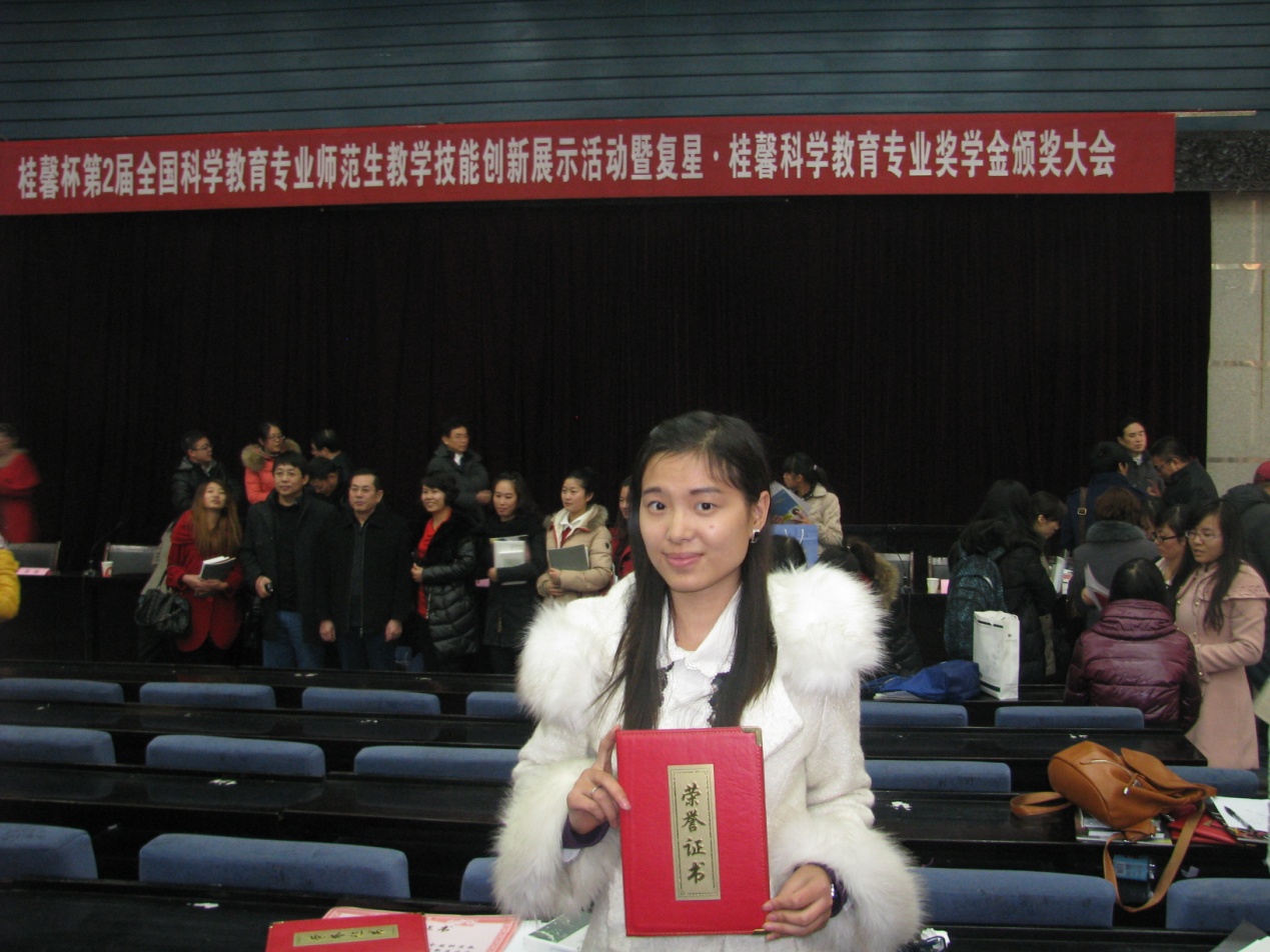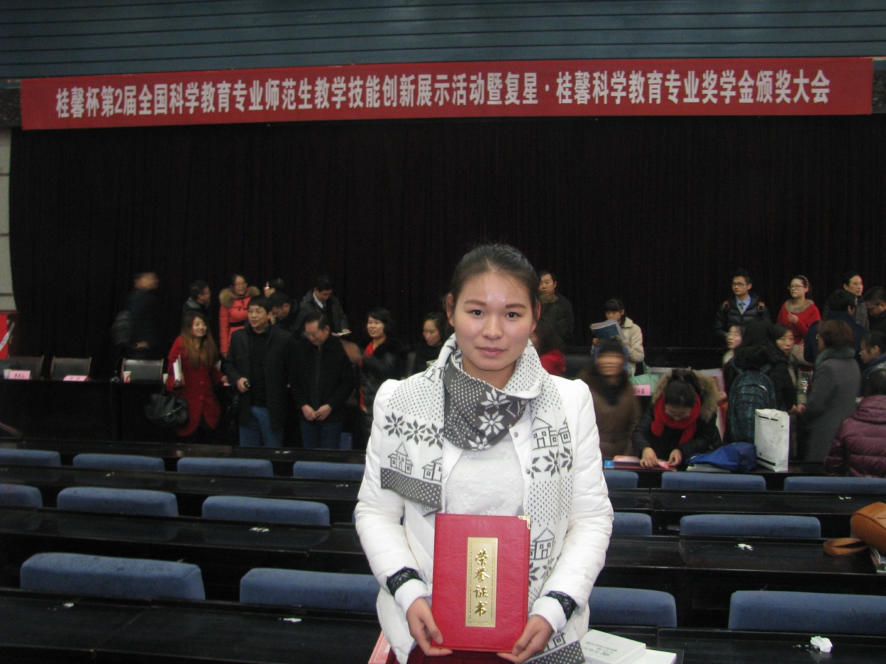 复星•桂馨科学教育专业奖学金,是由中国教育学会科学教育分会、复星集团、北京桂馨慈善基金会联合设立的,国内首个面向科学教育专业的奖学金!该奖学金在全国开设科学教育专业的约80所高等院校中,共评出38名奖学金获得者。经过认真评选,我校化学系科学教育专业学生王彩霞、焦莹莹荣获二等奖学金。另外,在桂馨杯全国科学教育专业师范生教学技能创新展示活动中,来自全国的70余名科学教育专业师范生经过演讲、模拟课和答辩三个环节的激烈角逐,我校化学系科学教育专业学生赵珂珂、宋梦婷荣获优秀奖。