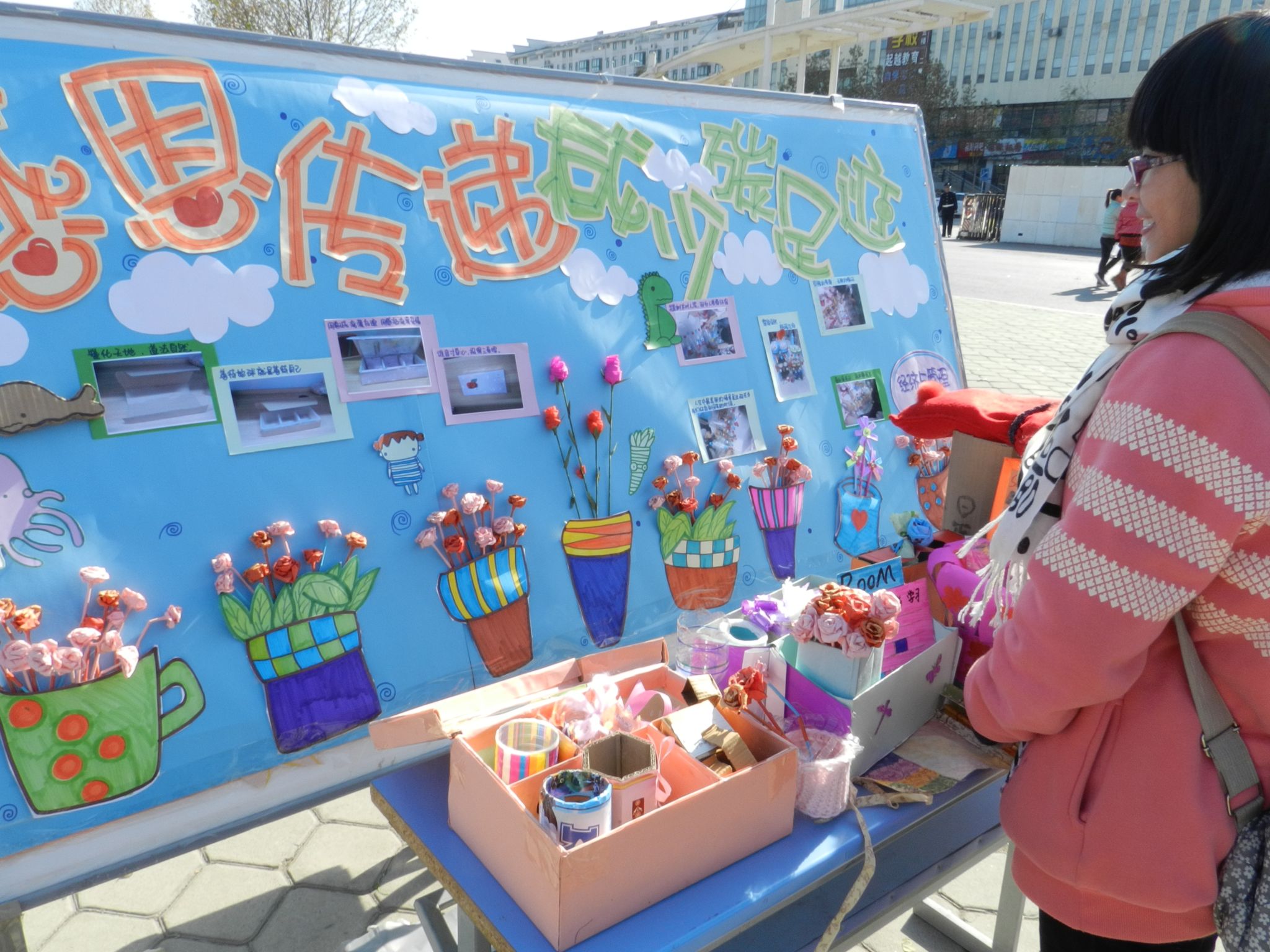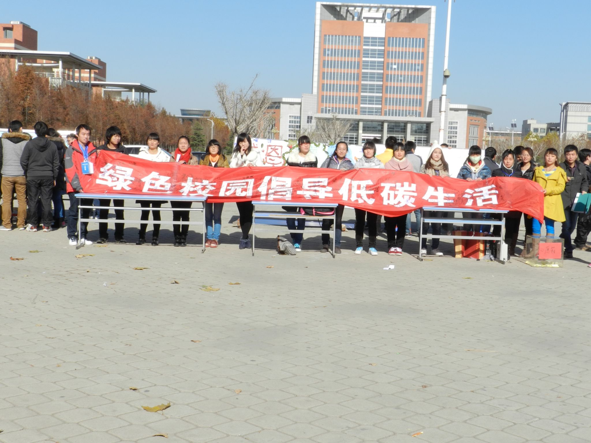 11月28日,感恩节当天,各院(系)积极响应,同学们自己动手,利用废旧报纸、衣服、筷子、饮料瓶、树叶等材料制作“变废为宝”宣传展板在西校区门前广场展出。同时,同学们积极为各院系展板投票,参与环保知识有奖竞答。