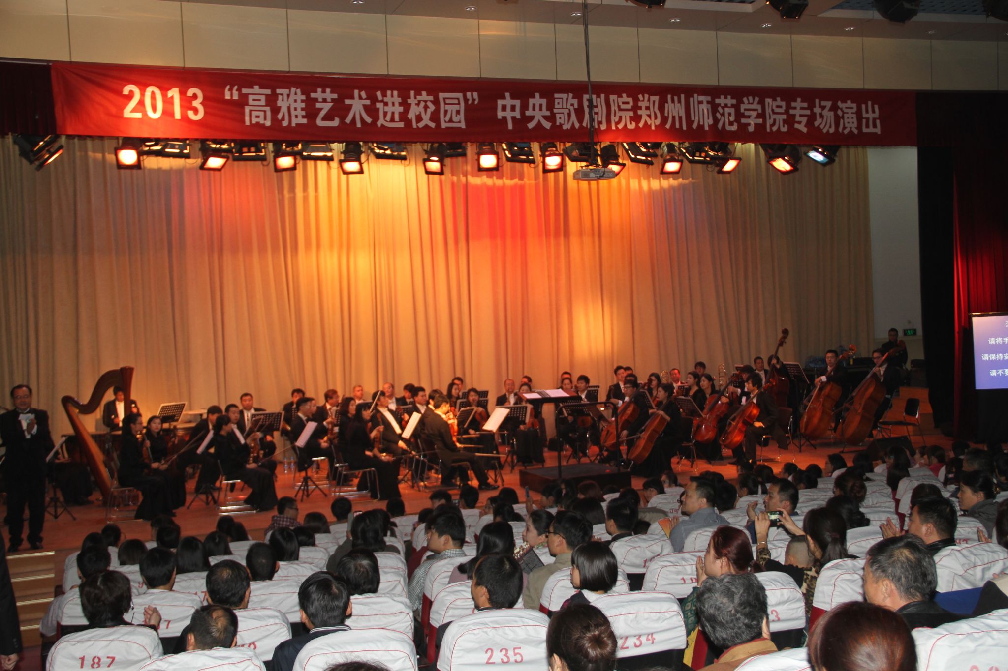 10月21日晚,由教育部、文化部、财政部主办,河南省教育厅承办的2013年“高雅艺术进校园”中央歌剧院郑州师范学院专场演出在我校七号楼学术报告厅举行。河南省教育厅体卫艺处副处长刘志平、校党委书记于向英,党委副书记、工会主席弓民以及我校500余名师生一同观看了此次演出。