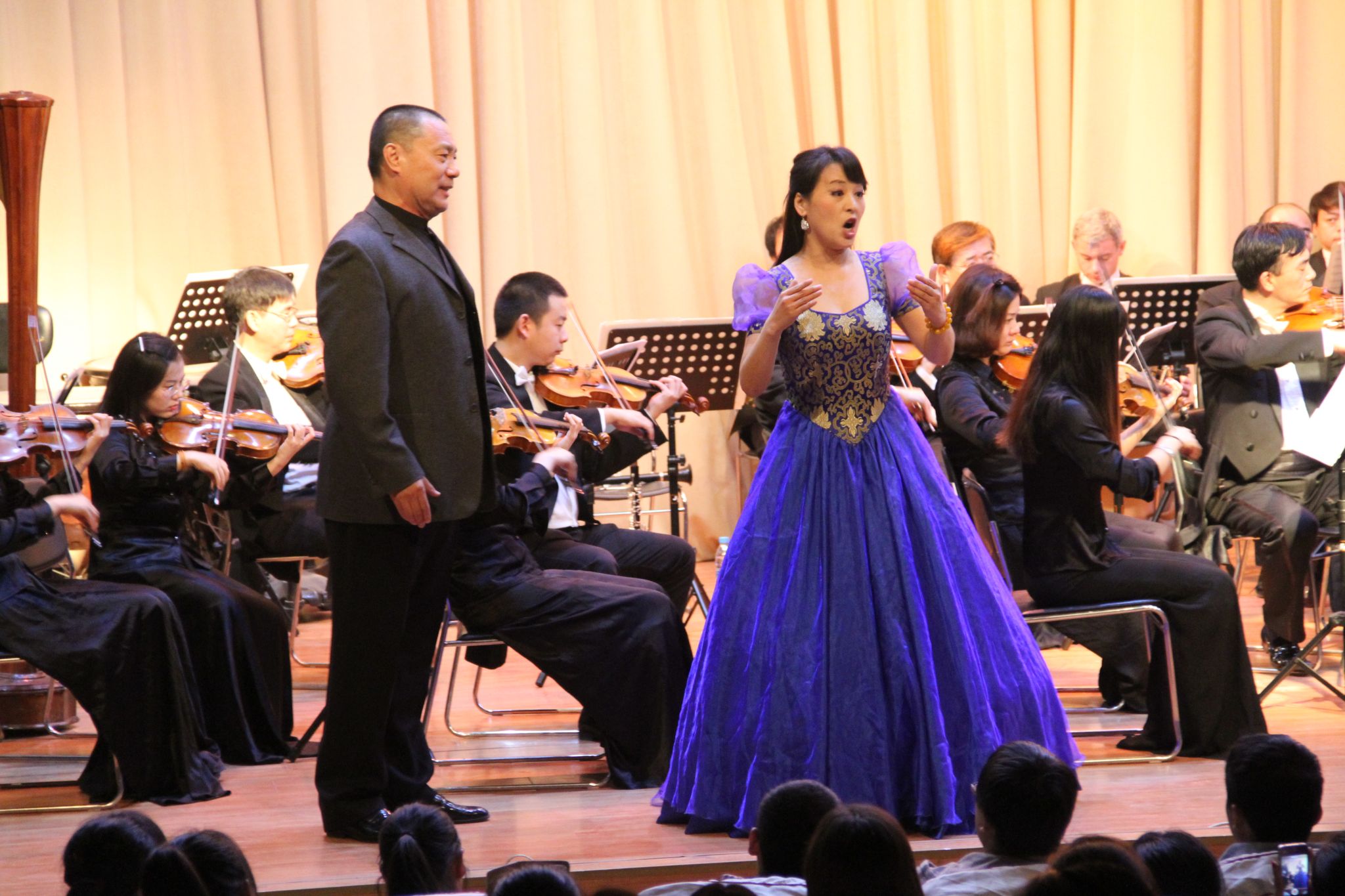 在歌剧《卡门》的乐曲声中,本次演出拉开帷幕。中央歌剧院的艺术家王红、耿哲、王立民、向子文等人分别以独唱、二重唱、四重唱等多种演唱形式,运用法语、意大利语等多种语言精彩地演唱了《卡门》、《弄臣》、《图兰朵》等世界经典歌剧选段。著名女高音歌唱家王红演唱的卡门的咏叹调“爱情像一只自由鸟”仿佛把现场的人们带进了一个自由翱翔的世界;著名歌唱家高蕾、牛莎莎、孙雪曼、耿哲、吴彦彧、阮余群表演的歌剧《霍夫曼的故事》选曲二重唱“船歌”、费加罗的咏叹调“再不要去做情郎”、歌剧《詹尼斯基奇》选曲劳蕾塔的咏叹调“我亲爱的爸爸”以其优美的旋律、动听的歌声、独特的剧情以及丰富多彩的演奏方式深深打动了在场的每一位观众,使人陶醉其中,不能自已。现场掌声雷动,一次次将现场的气氛推向高潮。在整场演出过程中,中央歌剧院的艺术家们还与我校学生互动,默契配合,共同完成《茶花女》的歌剧场景演出。演出最后,艺术家们唱起了耳熟能详的《饮酒歌》、《拉德斯基进行曲》,全体观众以热烈的掌声随着音乐打起节拍,表达对艺术家们的敬佩及感谢。