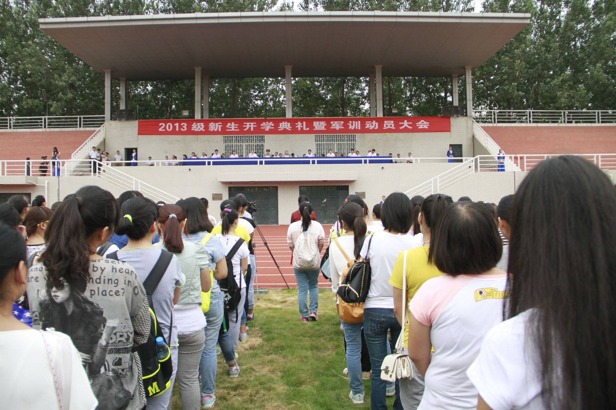 在庄严的国歌声中,2013级新生开学典礼暨军训动员大会拉开帷幕。教师代表、数学与统计学院教师石玉,老生代表、初等教育学院2012级学生史雪珂,新生代表、文学院2013级学生杨宁霞,承训单位71621部队营长梁为民分别发言。