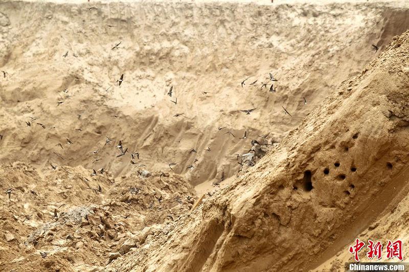 5月23日,河南新郑市郑新公路与祥云路交叉口南侧300米处一居民楼建筑工地内,有一个深约10米、足球场大小的基坑,在基坑西侧和南侧的断面上,密密麻麻分布着数不清的拳头大小的洞穴,上万只燕子在地基坑断面上打洞筑巢。据郑州师范学院自然博物馆馆长李长看介绍,这些燕子是崖沙燕,属于候鸟,秋冬季节就要飞到南方越冬,所以在北方生活的时间并不会太长。5月份是它们的孵化期,等到7月份,雏鸟就能学会飞翔,自己觅食。该事件经媒体曝光后,引发民众高度关注。施工方称,为了保护燕子现在已经暂缓施工。(中新社发王中举 摄)