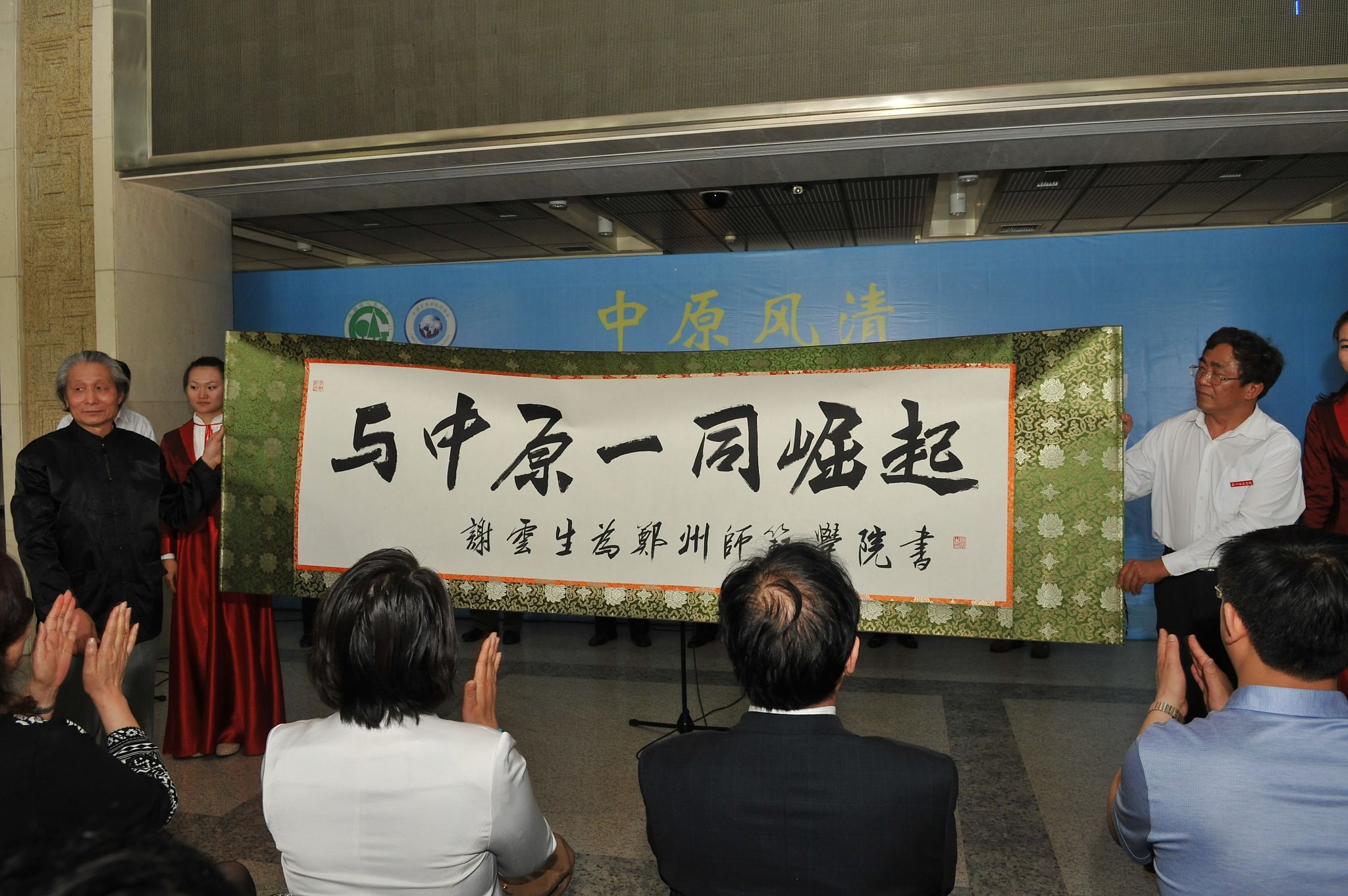 开幕式上,校长赵健致欢迎词,赵校长代表学校对各位领导和艺术名家的到来,表示热烈欢迎。著名书画大师谢云生与著名书法家许挺一同为“中原风清”书画展提笔开幕,谢云生和谢向英,分别向我校捐赠了“与中原一同崛起”书法作品以及“中华国礼——孔子真丝织锦画” ,及《雨后的丁香》《品若梅花》《幽兰引》等系列图书。