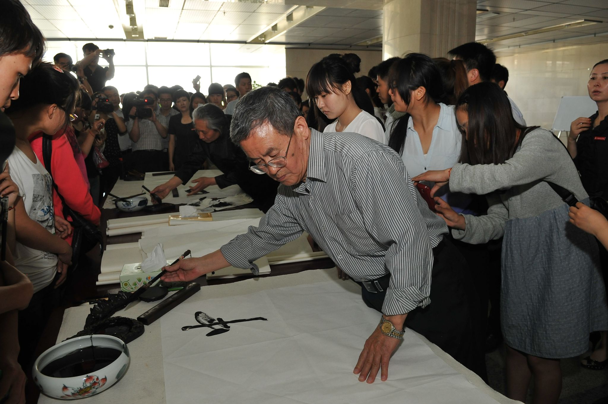 随后,谢云生为我校美术学院学生作了“魏碑书法艺术的传承与发展”的专题讲座,用艺术成就繁荣的中国梦;谢向英举行“为雅安加油”签名售书并与学生现场互动交流,用大爱诠释中华民族的一脉相承,用艺术温暖“中国梦”。活动结束后,一行人在我校领导的陪同下,参观了学校内独具特色的郑州自然博物馆和美术展厅。