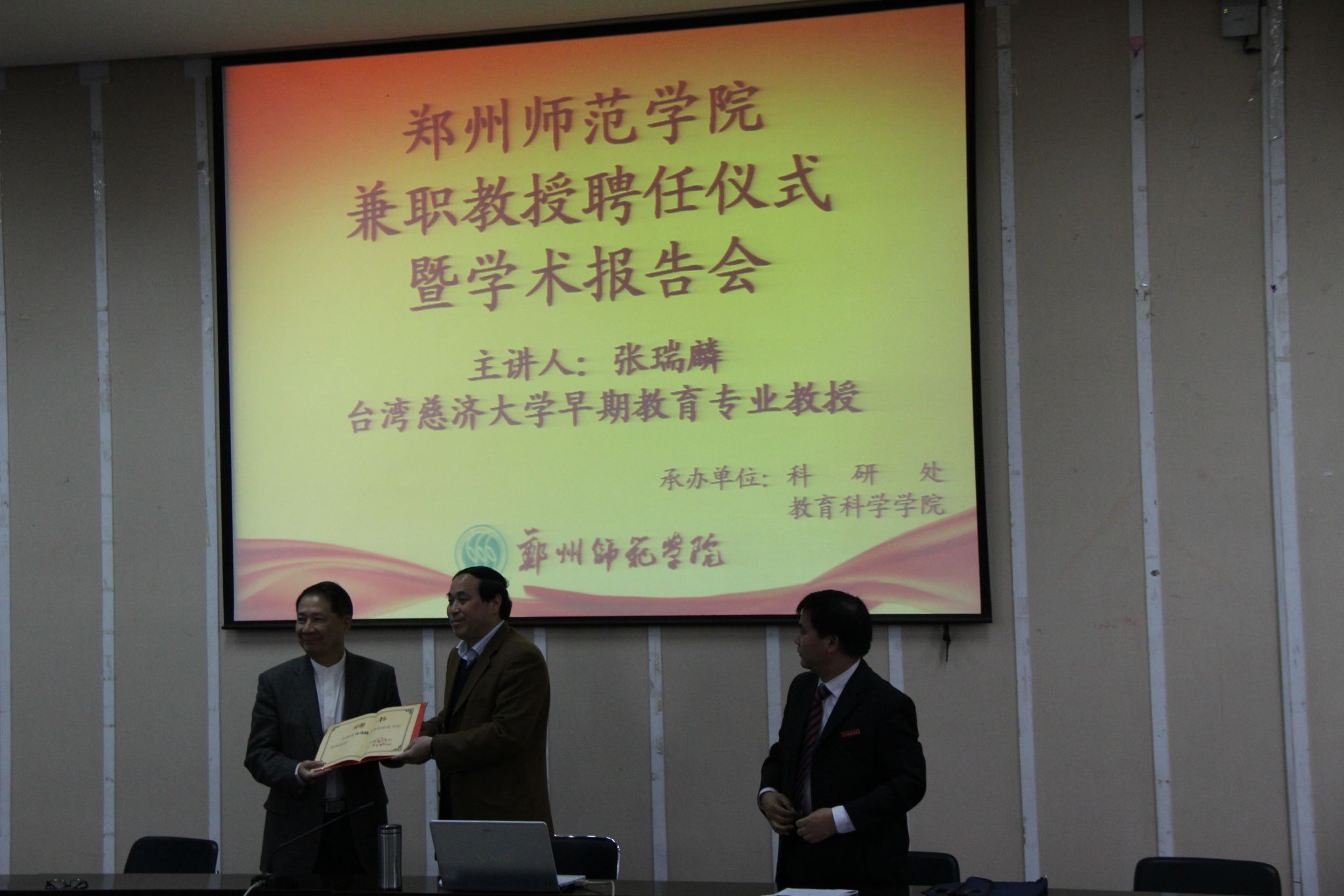 张瑞麟教授受聘为我校兼职教授,副校长王北生为其颁发聘书并讲话,王校长强调了早期教育的重要性,指出百年大计,教育为本,教育大计,始于学前,并希望广大师生学会生存、学会生活,重视人性教育,做智慧型教师。