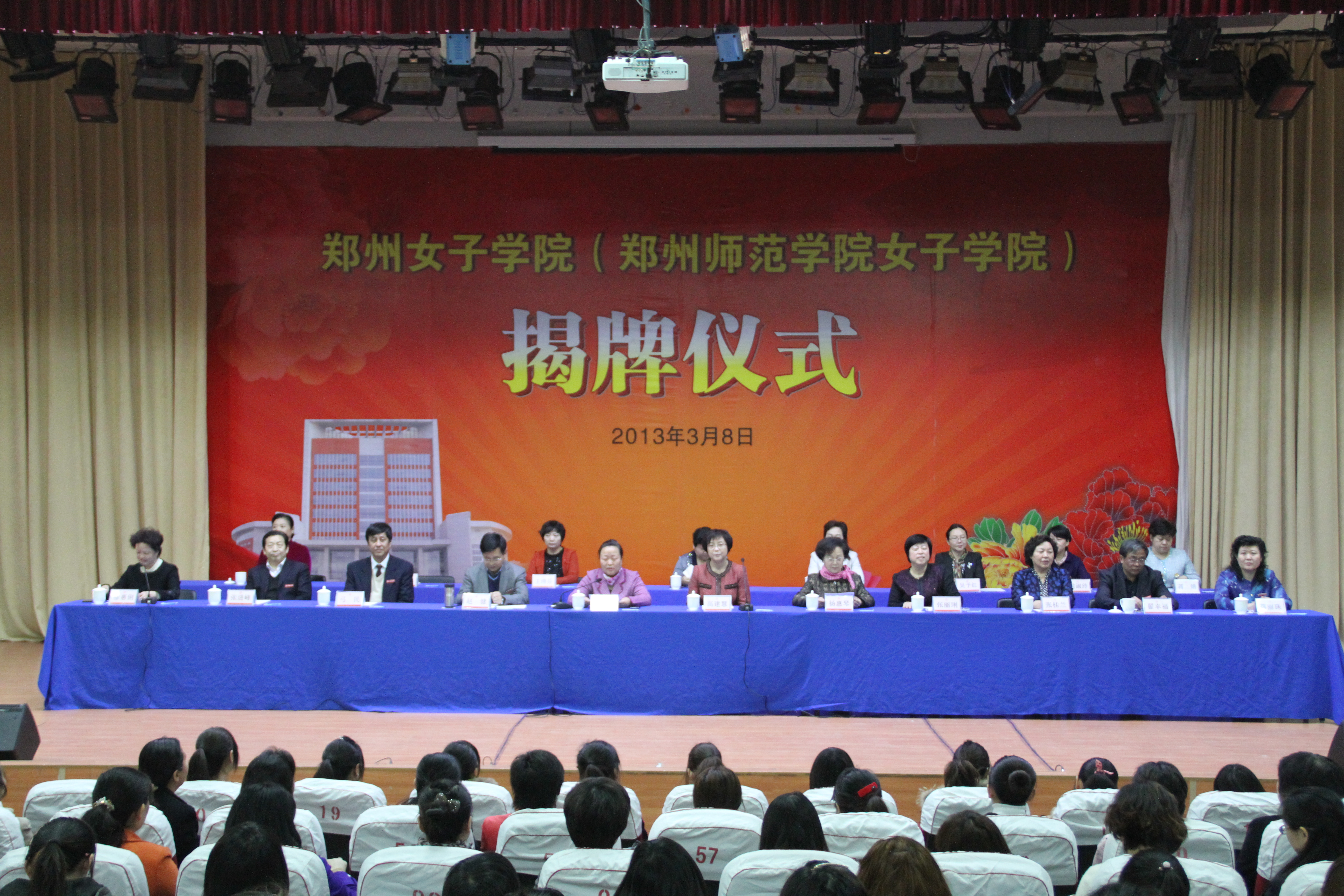 揭牌仪式上,郑州市委常委、组织部长高建慧、郑州市第十一届政协主席杨惠琴、郑州师范学院党委书记于向英、郑州师范学院校长(教授、博士)赵健、中华女子学院管理学院院长(教授)张丽琍、郑州职业技术学院党委书记张桂兰,郑州女子学院(郑州师院女子学院)院务委员会、常设机构组成人员,郑州师范学院及郑州市妇联部分班子成员等领导出席并在主席台就座,各(县)市区及市直机关各单位女干部、市妇联机关全体干部及我校师生代表等共600余人参加揭牌仪式。