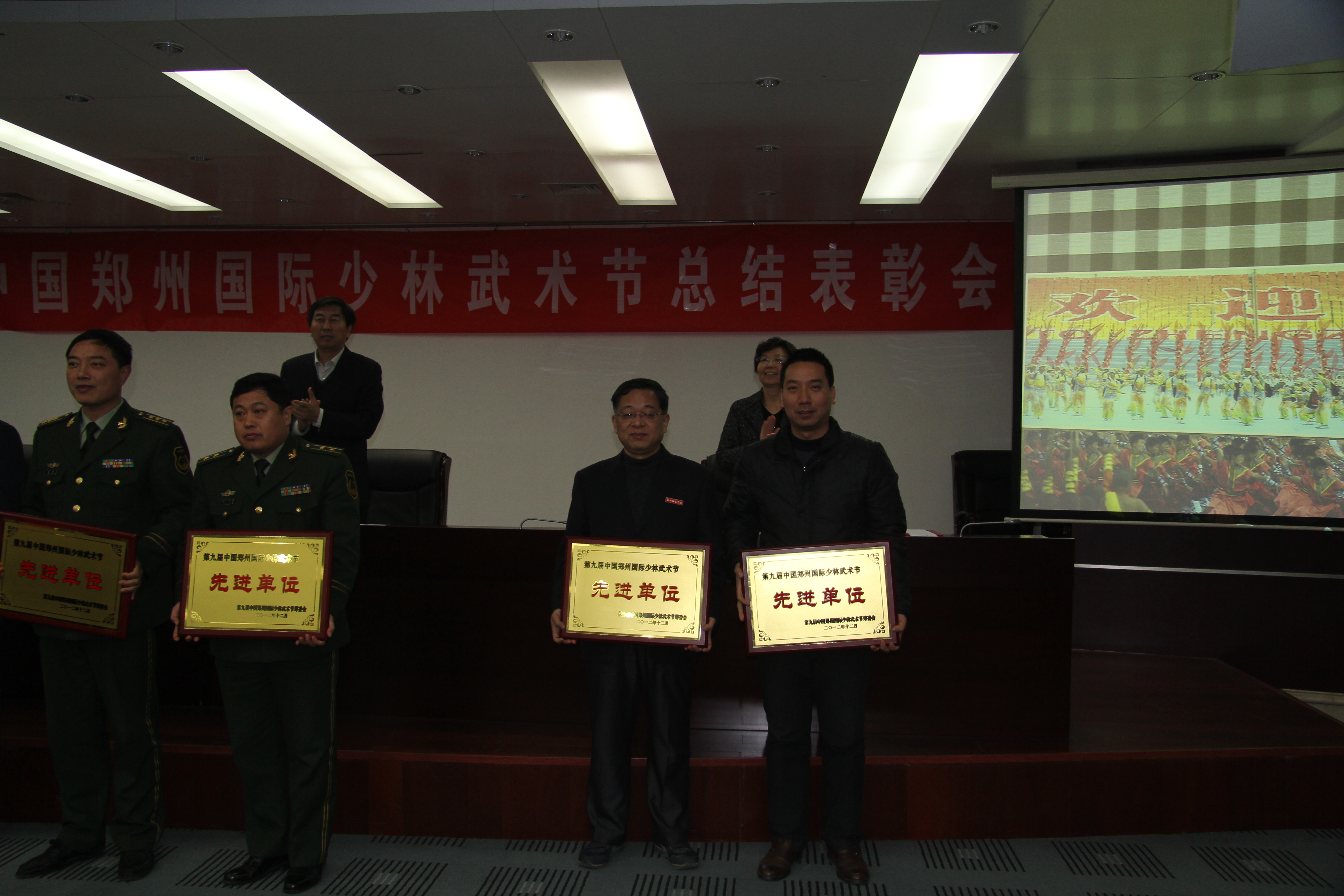 1月15日上午,在郑州市人民政府综合楼二楼会议室召开了第九届中国郑州国际少林武术节总结表彰会,河南省体育局副局长王鹏,中共郑州市委常委、宣传部长王哲,郑州市人民政府副市长刘东出席会议并讲话,会议由郑州市人民政府办公厅副秘书长王霄鹂主持。参与第九届中国郑州国际少林武术节筹备工作的100多位单位代表参加了会议。大会总结了第九届中国郑州国际少林武术节的各项工作,并对筹备中的先进单位和个人进行了表彰。我校学生处处长杨朝红代表学校接受了武术节筹委会授予的“第九届中国郑州国际少林武术节先进单位”的奖牌。