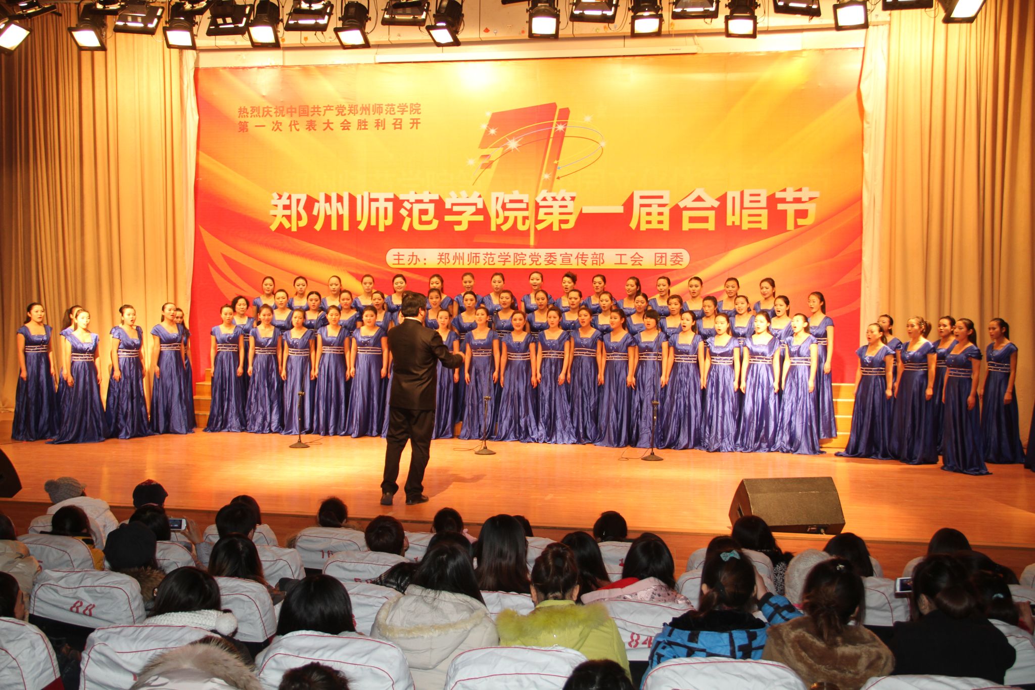 为热烈庆祝我校第一次党代会的胜利召开,12月19日晚,由我校党委宣传部、工会、团委主办的我校“第一届合唱节合唱比赛”决赛在七号楼学术报告厅隆重举行。校领导于向英、赵健、弓民、翟幸福、张进峰、王北生、蒋丽珠、张建航、孔青、贾敏仁、赵玉岭出席此次比赛。