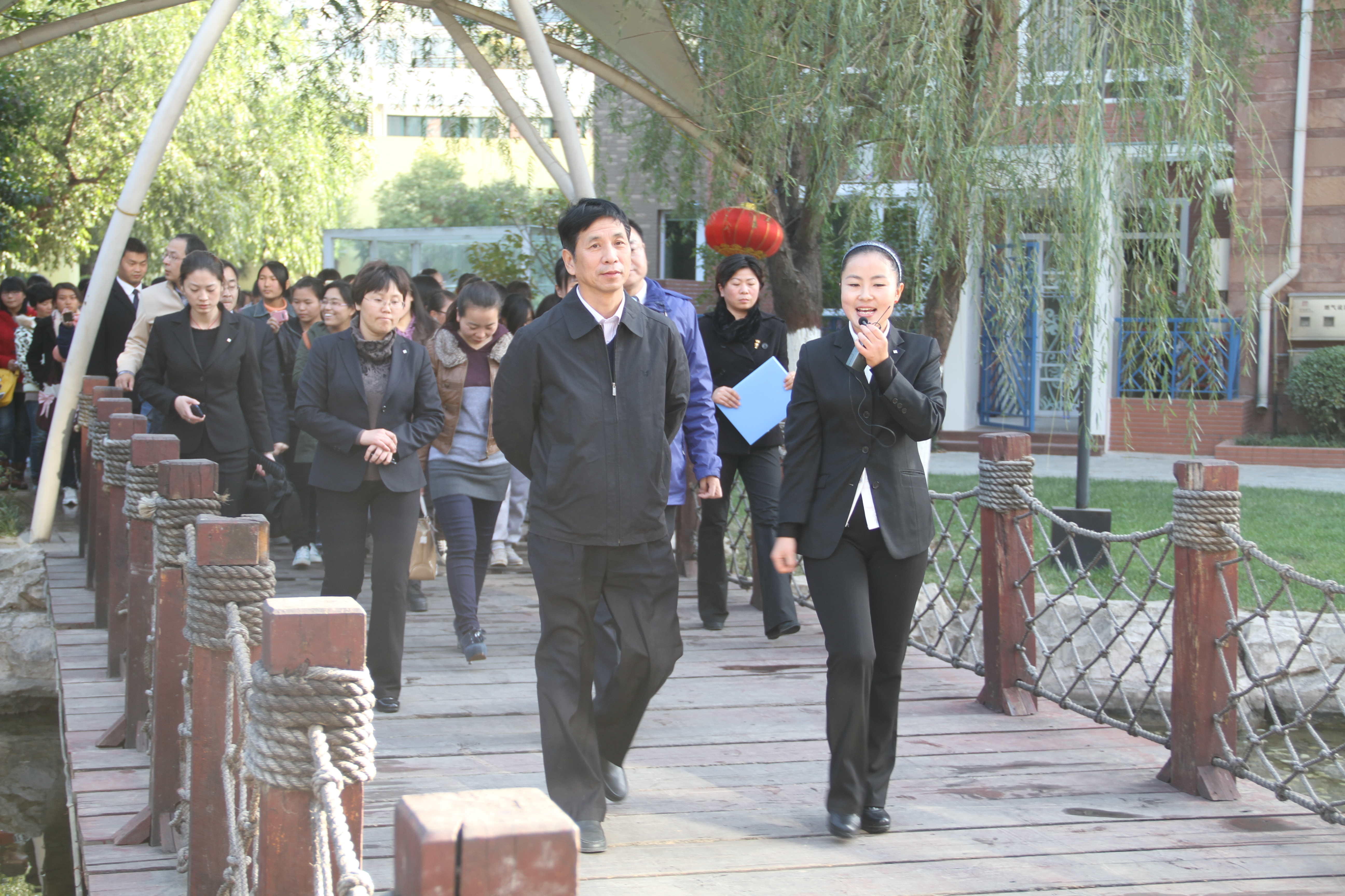 在专业讲解人员带领下,张建航校长和经管学院的老师、同学沿着胡锦涛总书记2007年视察该小区时的路线参观了小区风貌,并进入到小区的消防体验室、监控中心等实地考察。