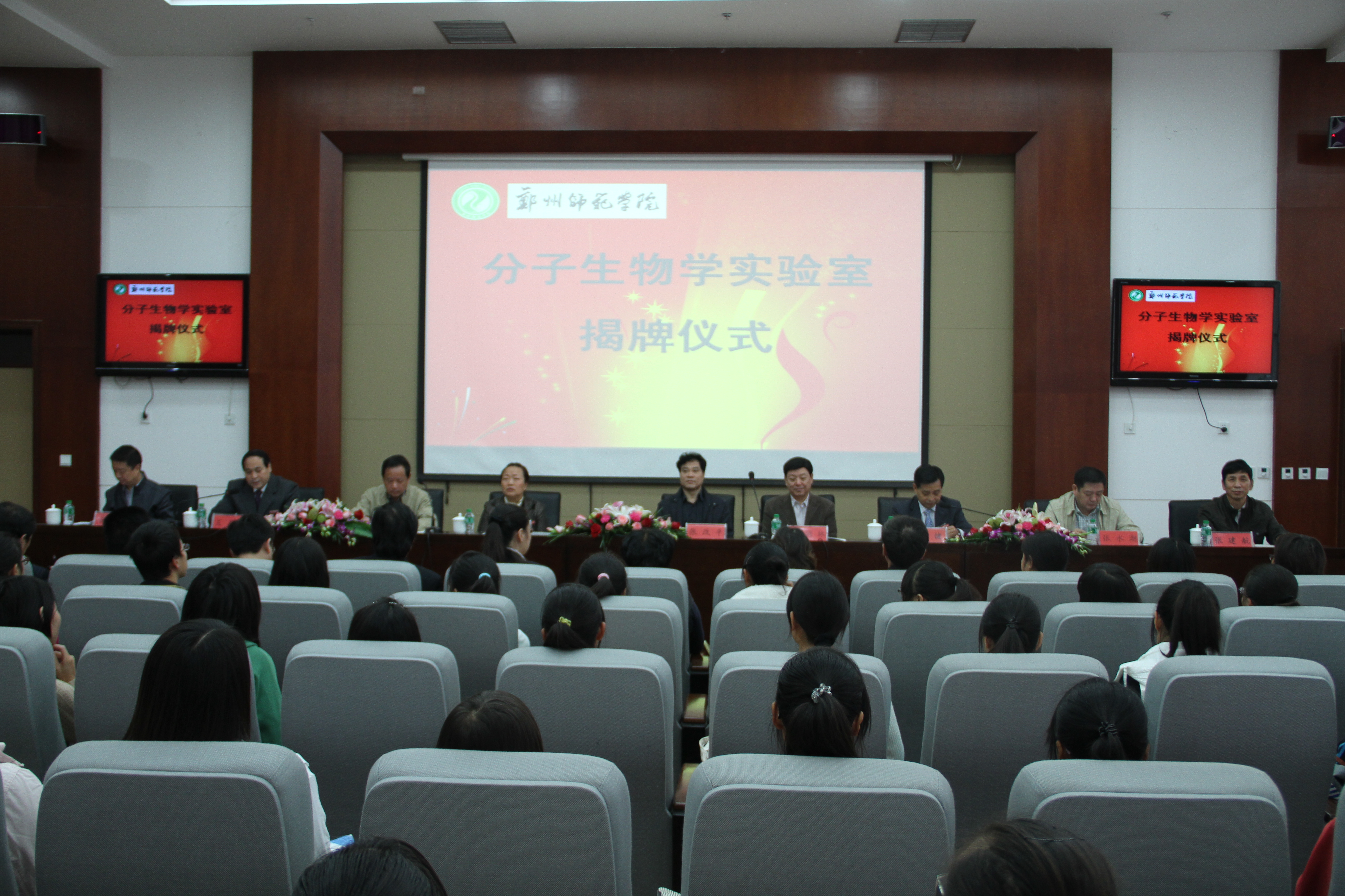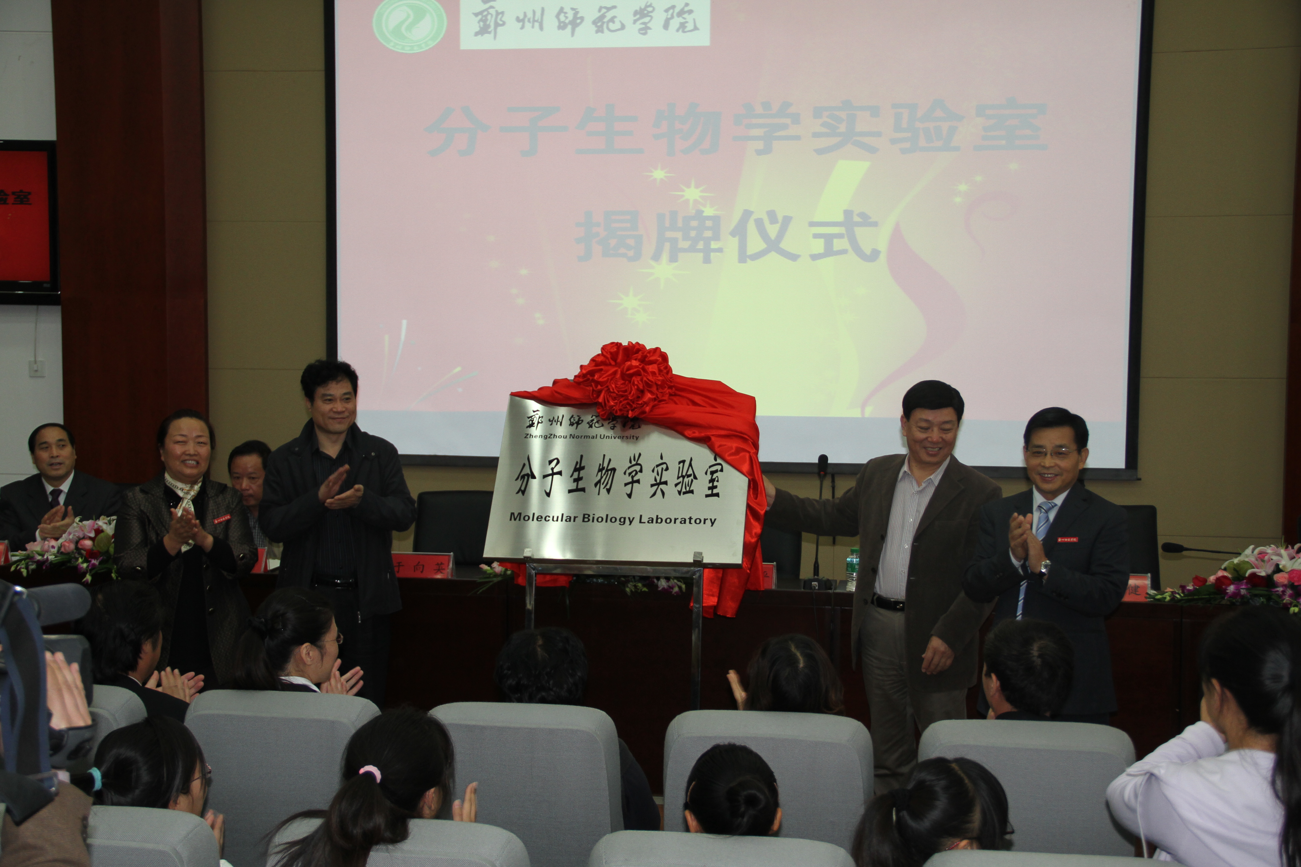 在融洽的气氛中,马润林教授、张改平院士、党委书记于向英、院长赵健为我校"分子生物学实验室"揭牌。