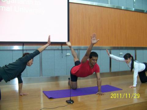 Yogananth大师围绕瑜伽的起源以及其蕴涵的精神展开了报告,并结合自身经历指出,练习瑜伽不仅能够使人保持良好的心境,还有助于塑造身形,预防疾病的侵害。报告会上,Yogananth大师亲自展示了瑜伽中一系列的高难度动作,并请现场同学上台一起参与体验。Yogananth大师风趣幽默的讲授,并配合演示高难度瑜伽动作,给在座师生留下了深刻的印象。