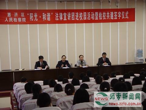 10月30日上午,我校在一号楼报告厅举行惠济区人民检察院“阳光・和谐”法律宣讲团进校园活动暨检校共建签字仪式,惠济区人民检察院检察长裴文典、副检察长陈增瑞、我校党委书记于向英、副书记樊豫陇等出席仪式,惠济区人民检察院部分检察官、我校部分专职辅导员及政治系学生200余人参加了签字仪式。