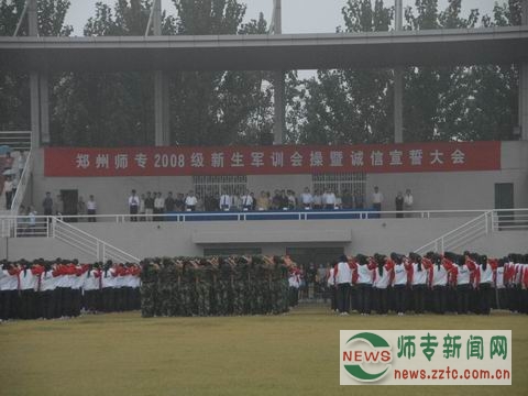 9月19日上午8:30,我校2008级新生军训会操暨诚信宣誓大会在体育场举行。校领导于向英、赵健、樊豫陇、张建航、孔青、崔东升、贾敏仁及各系(部)书记、主任出席大会。大会由校党委副书记、副校长樊豫陇主持。