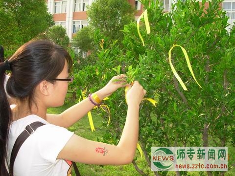 5月20日,我校五年制05级特殊教育班的23名同学自发组织起来,用班费买来黄色的丝带,裁剪后在上面写上祝福的话语,为地震灾区人民祈福。 “情系四川,天佑中华”等字样深刻表达了师专学子心系灾区、祝福祖国的强烈愿望。她们纷纷将这些丝带系在校园道路两旁的树枝上、系在老师们的车上、系在过往同学们的手腕上……以此来表达对灾区遇难同胞的沉痛哀悼,唤起更多的人为灾区人民祈福。