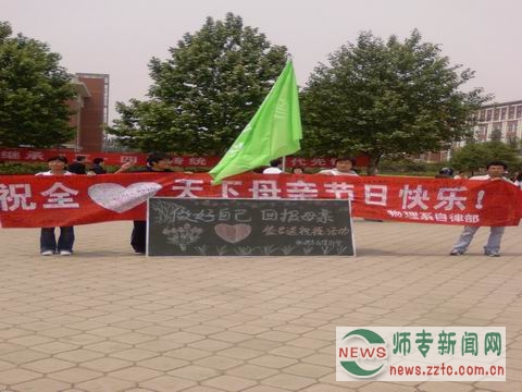 在母亲节来临之际,为更好地引导广大学生感恩母亲,报效祖国,5月9日上午,大学生记者团、物理系学生会分别在操场主干道和校门口广场举办了“感恩母亲节”与“做好自己,回报母亲”签名送祝福活动。