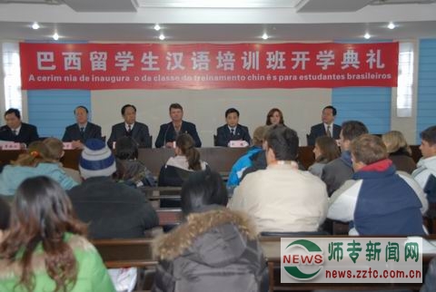 2月25日,我校第二届巴西留学生汉语培训班开学典礼在行政楼401室举行。巴西诺茵维莱市尤尼维尔大学校长保罗、国际事务协调员克里斯塔娜,郑州市教育局副局长郭金汉、市外事办副主任张树忱,我校领导赵健、周静宇、贾敏仁出席现场。来自巴西诺茵维莱市的30名留学生参加了开学典礼。开学典礼由副校长贾敏仁主持。