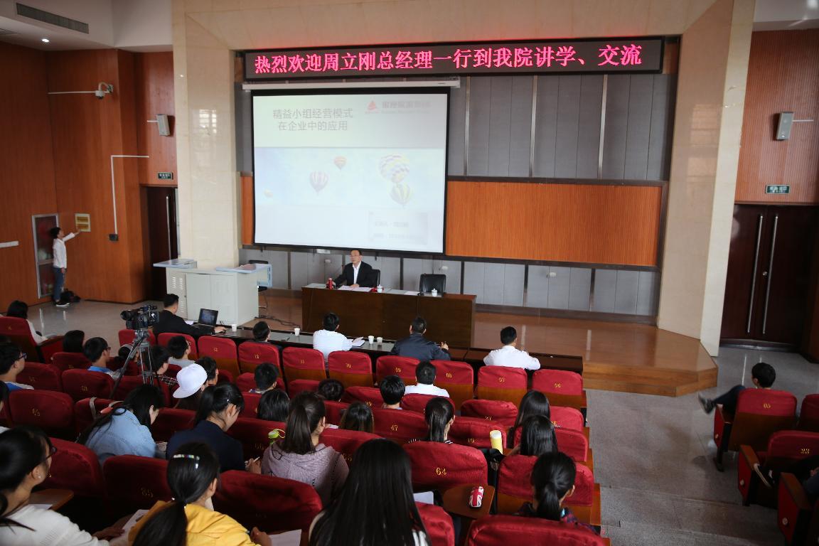 讲座中,周立刚博士从精益管理在酒店行业中的萌芽讲起,将其概括总结为导、引、细、约、跟、评六部法,逐步把广泛应用于制造业的精益管理引申到服务业,尽量压缩中层,采取精益小组模式,用倒三角管理法让人人都成为管理者的方法,在所属酒店推行精益管理。做到了在2015年全国酒店行业亏算56亿元的情况下,山东银座集团的酒店板块收入尽管下降,但利润却增加的良好态势。讲座期间,周立刚博士还向同学们发出邀请,欢迎同学们到银座集团实习实践,并在毕业以后到银座集团工作,为银座集团推广精益管理服务。