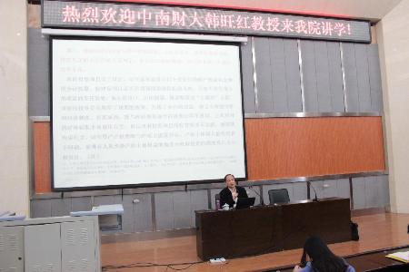 4月7日上午,中南财经政法大学金融学院教授、博士生导师、投资学专业硕士研究生导师组组长,中国投资协会理事,投资学专业建设委员会副主任韩旺红来我院讲学。