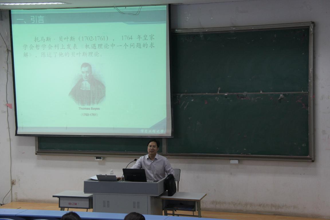 10月13日下午,信息工程大学卢一强教授应邀在我校公共教学楼C117为数学与统计学院教师和B14级统计学的学生作了一场题为《贝叶斯统计推断及蓬勃发展的统计学》的专题报告。