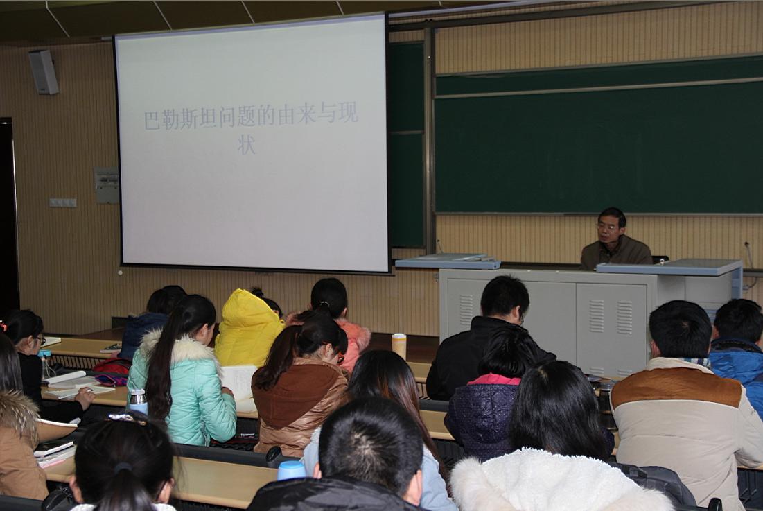 2014年12月15日下午,郑州大学历史学院世界史系主任、博士生导师、中国中东学会和中国世界近代史研究会理事陈天社教授,以“巴勒斯坦问题的由来与现状”为题,在综合楼B114教室为我校历史文化学院师生作了精彩报告。