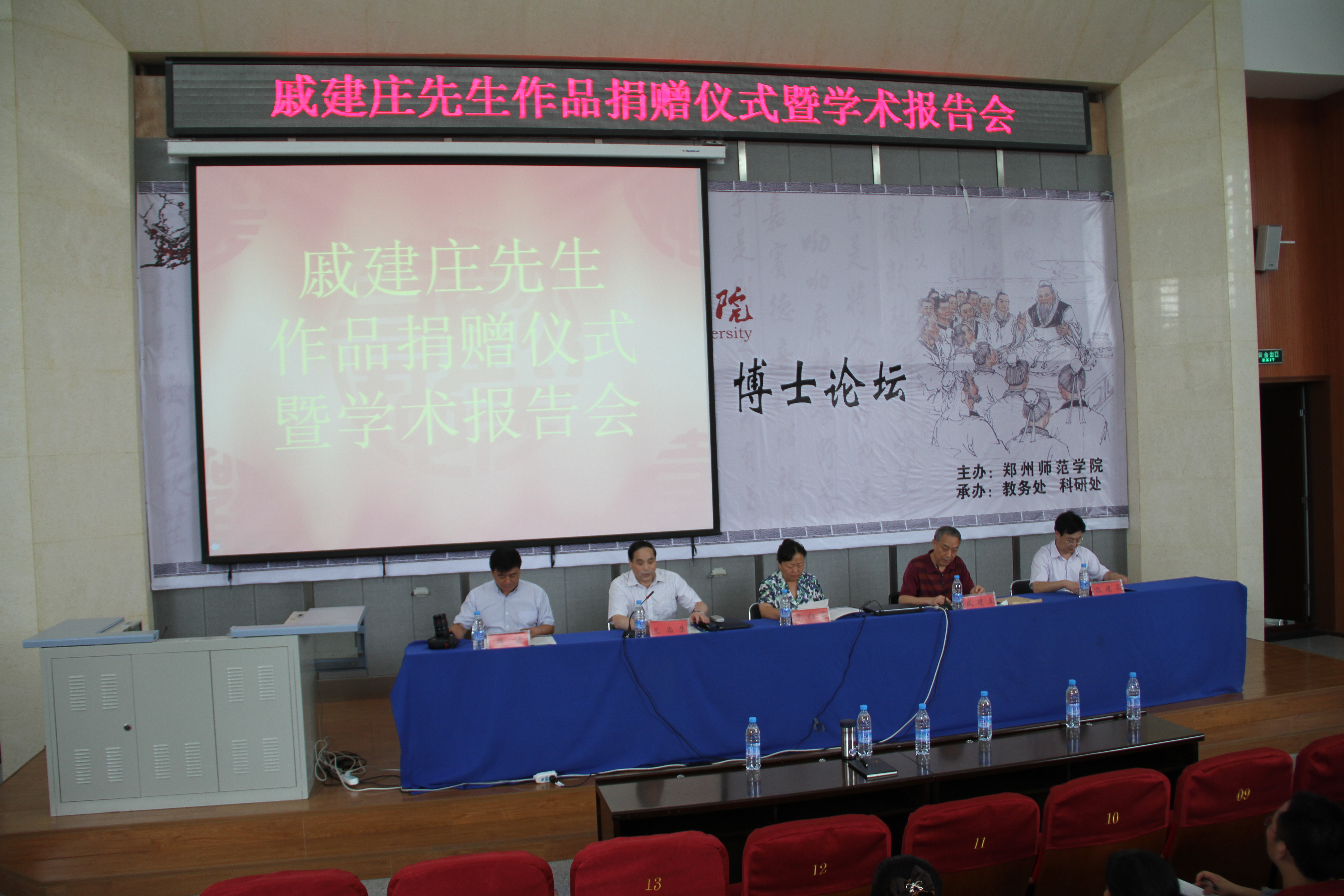 会上,戚建庄先生向我校图书馆捐赠了他的专著《城市发展战略》和《魅力中国书法作品》等图书,这是戚先生多年的研究成果,表达了对我校的关心和支持;校党委书记于向英为戚建庄先生颁发了郑州师范学院兼职教授聘书。仪式结束后,戚先生作了一场题为“中原梦与新型城镇化建设”的学术报告。