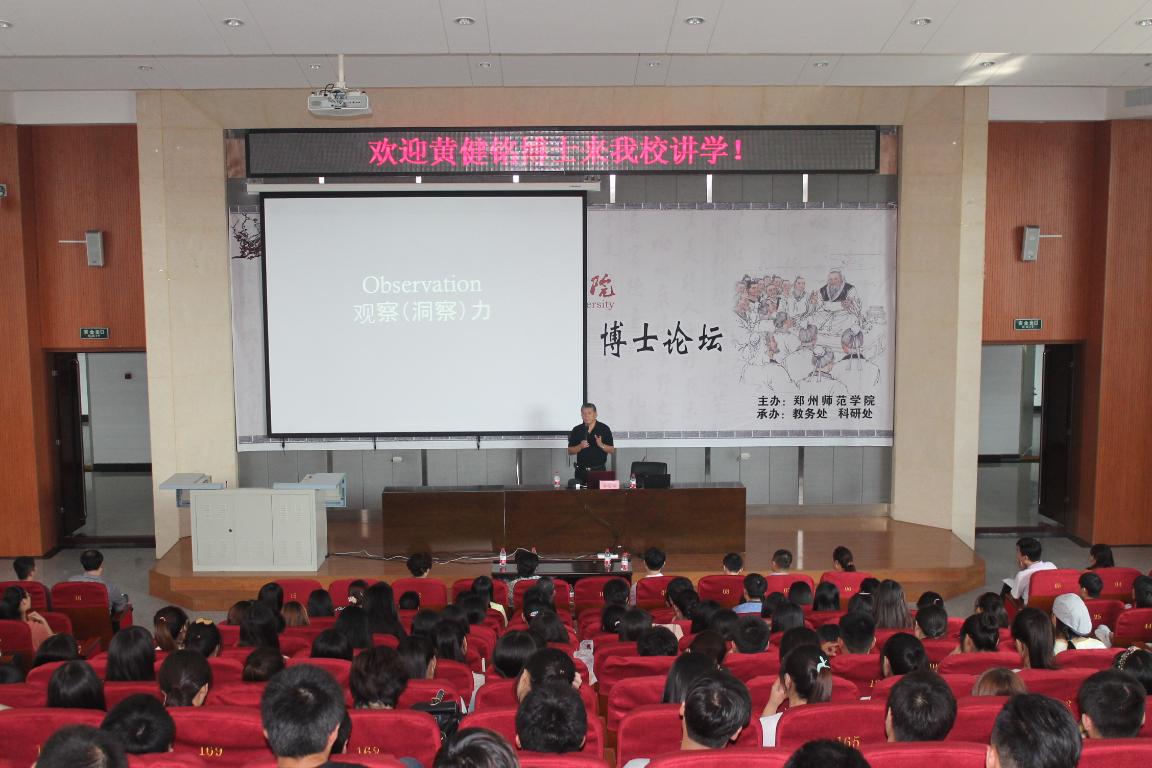 2014年9月22日下午,综合楼A301教室, 律典(上海)信息技术有限公司董事长黄健铭博士为信息工程与技术学院和软件学院师生作了一场“设计的智慧”的学术讲座。副校长蒋丽珠、科研处王永恒处长出席了本次交流会。副校长蒋丽珠向黄健铭博士颁发了郑州师范学院客座教授的聘书。