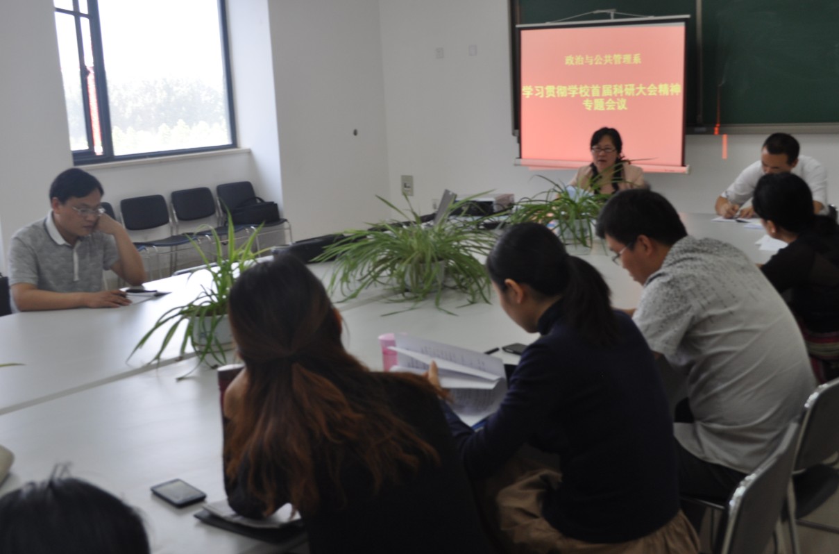 为进一步贯彻落实学校第一届科研大会精神,5月30日上午8:30,政治与公共管理系召开学习、贯彻学校首届科研大会精神专题会议,全系老师参加了此次专题会。