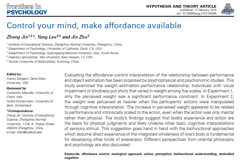 日前,我校教育科学研究所晋争博士(第一作者和通讯作者)及其合作者的论文在著名刊物Frontiers in psychology《心理学前沿》发表[Jin Z, Lee Y and Zhu J (2015) Control your mind, make affordance available. Front. Psychol. 6:96. doi: 10.3389/fpsyg.2015.00096]。