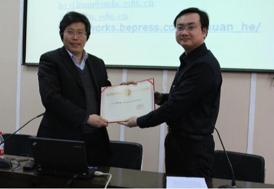 信息科学与技术学院胡明生院长、肖汉院长等领导和部分教师、学生聆听了报告。我院聘请何吉欢教授为客座教授,胡院长为何教授颁发了聘任证书。